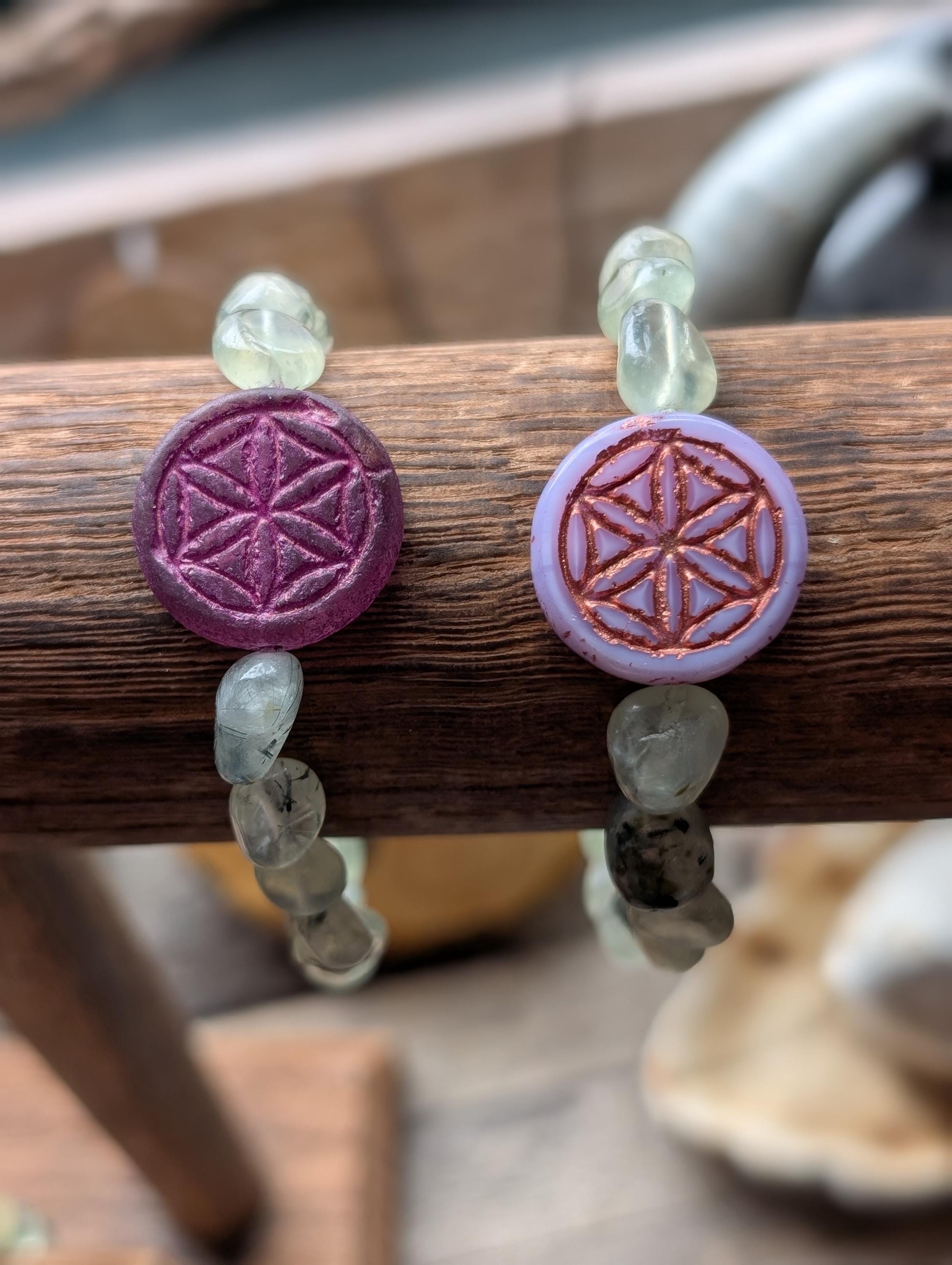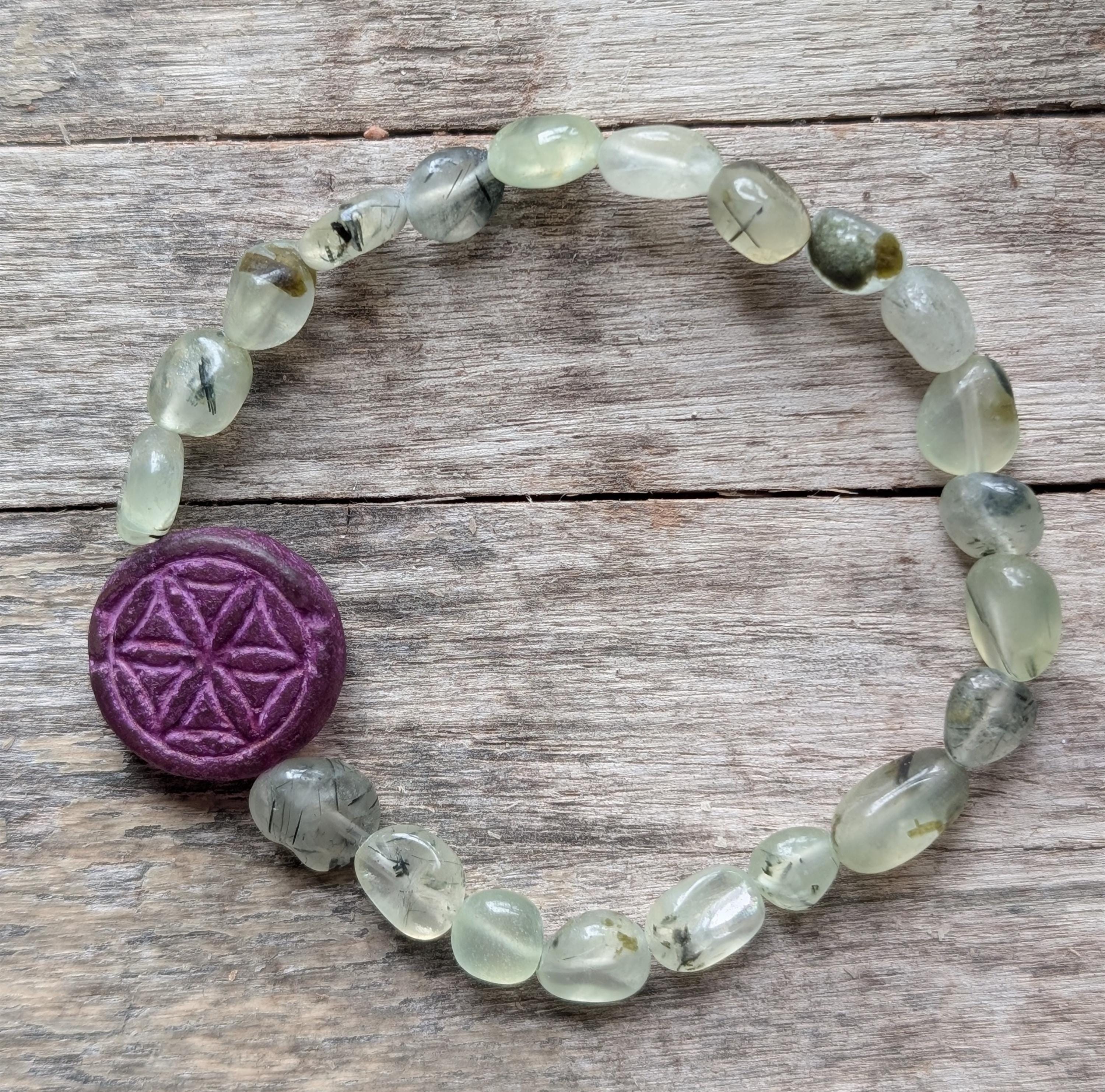 Embrace calm clarity and heart-centered energy with this handmade Prehnite nugget bracelet, accented with beautiful Czechoslovakian pressed glass charms — each carrying a powerful symbolic meaning. Designed to support intuition and emotional healing, this bracelet combines nature’s beauty with mindful intention.