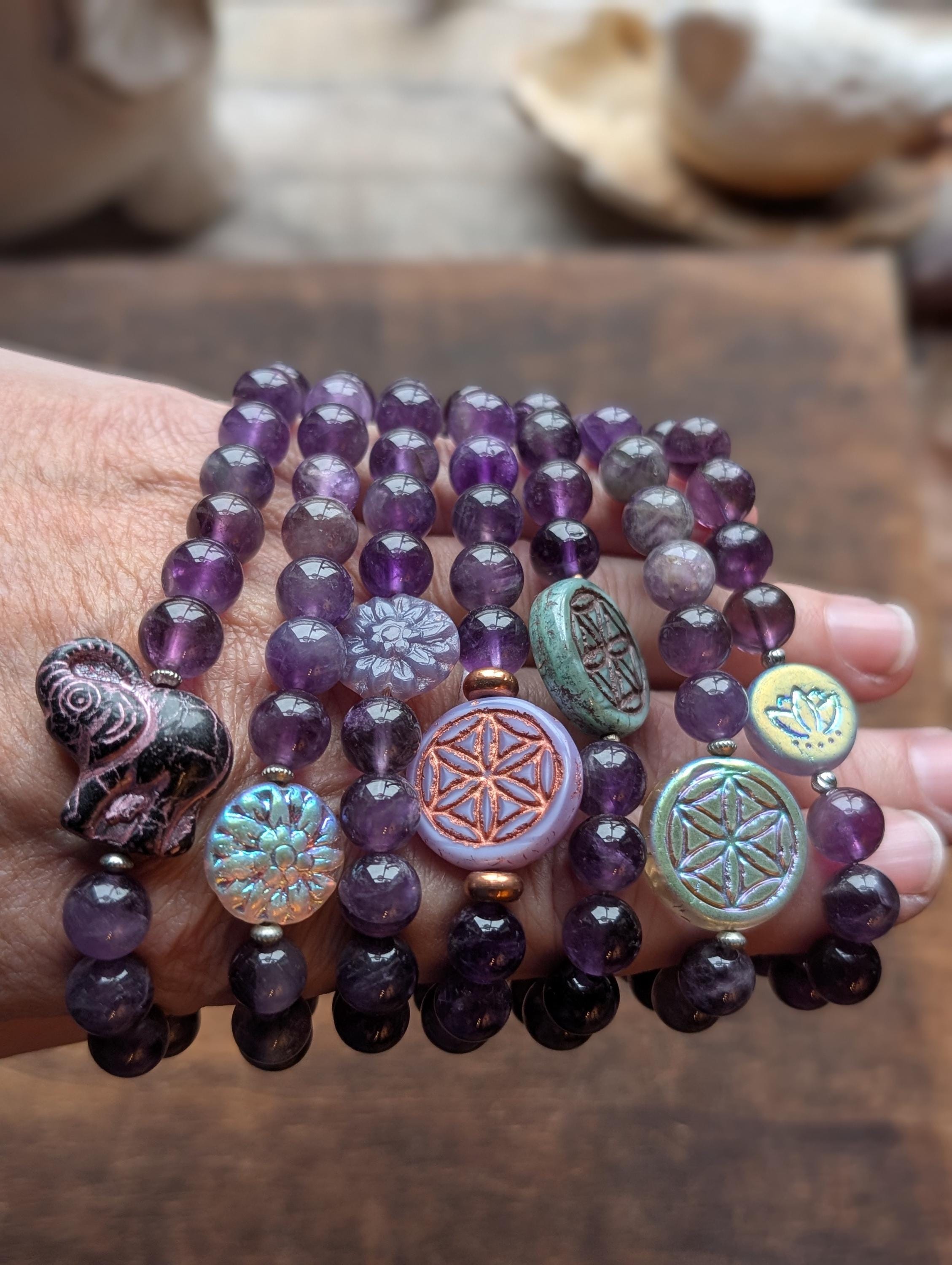 Amethyst Healing Bracelet • Czech Glass Symbol Beads, Handmade