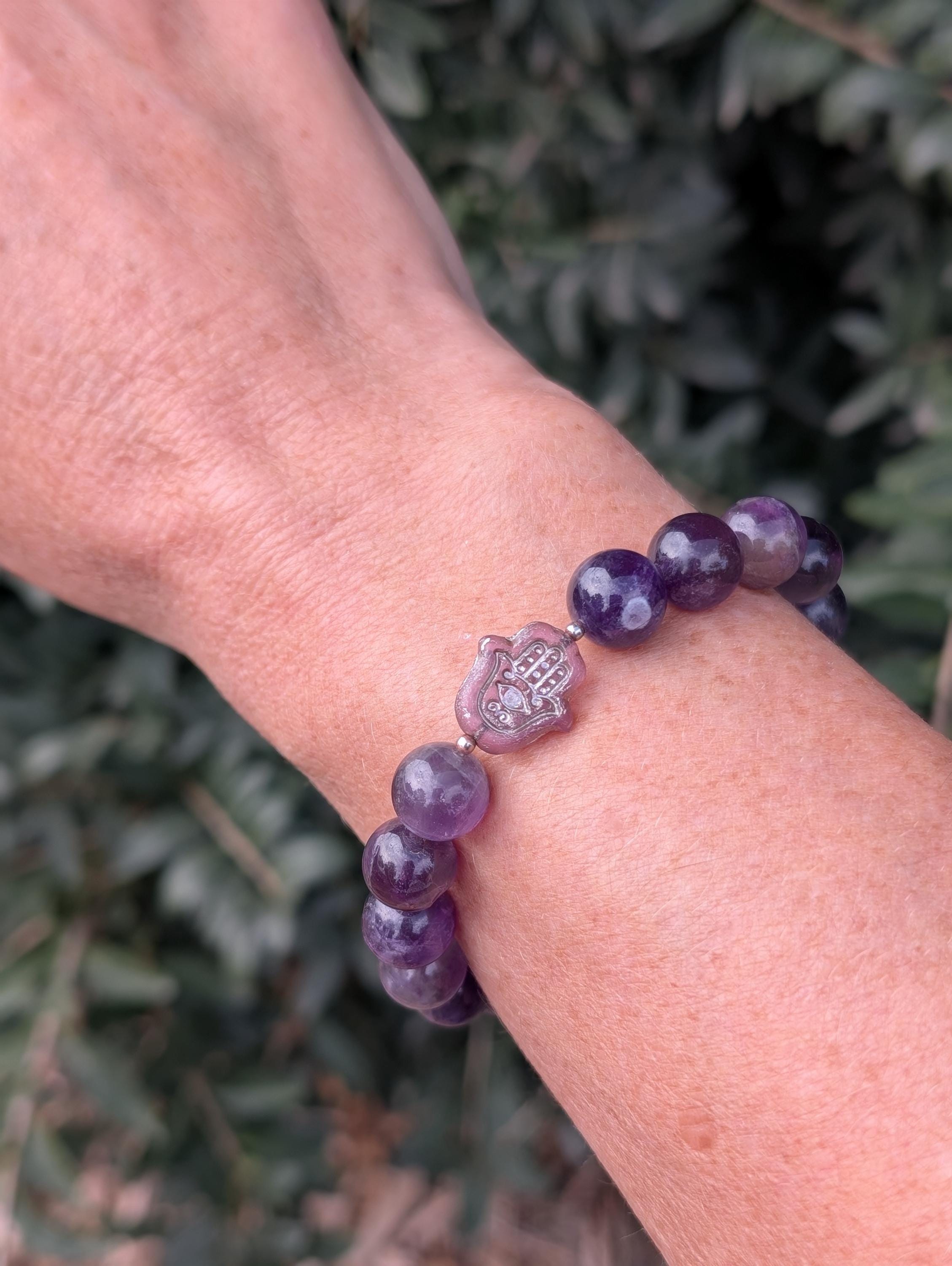 Bring calm, clarity, and spiritual harmony into your day with these handmade amethyst beaded bracelets, each adorned with a meaningful Czechoslovakian pressed glass symbol. Every bracelet is created with love and intention, offering both beauty and energetic significance.