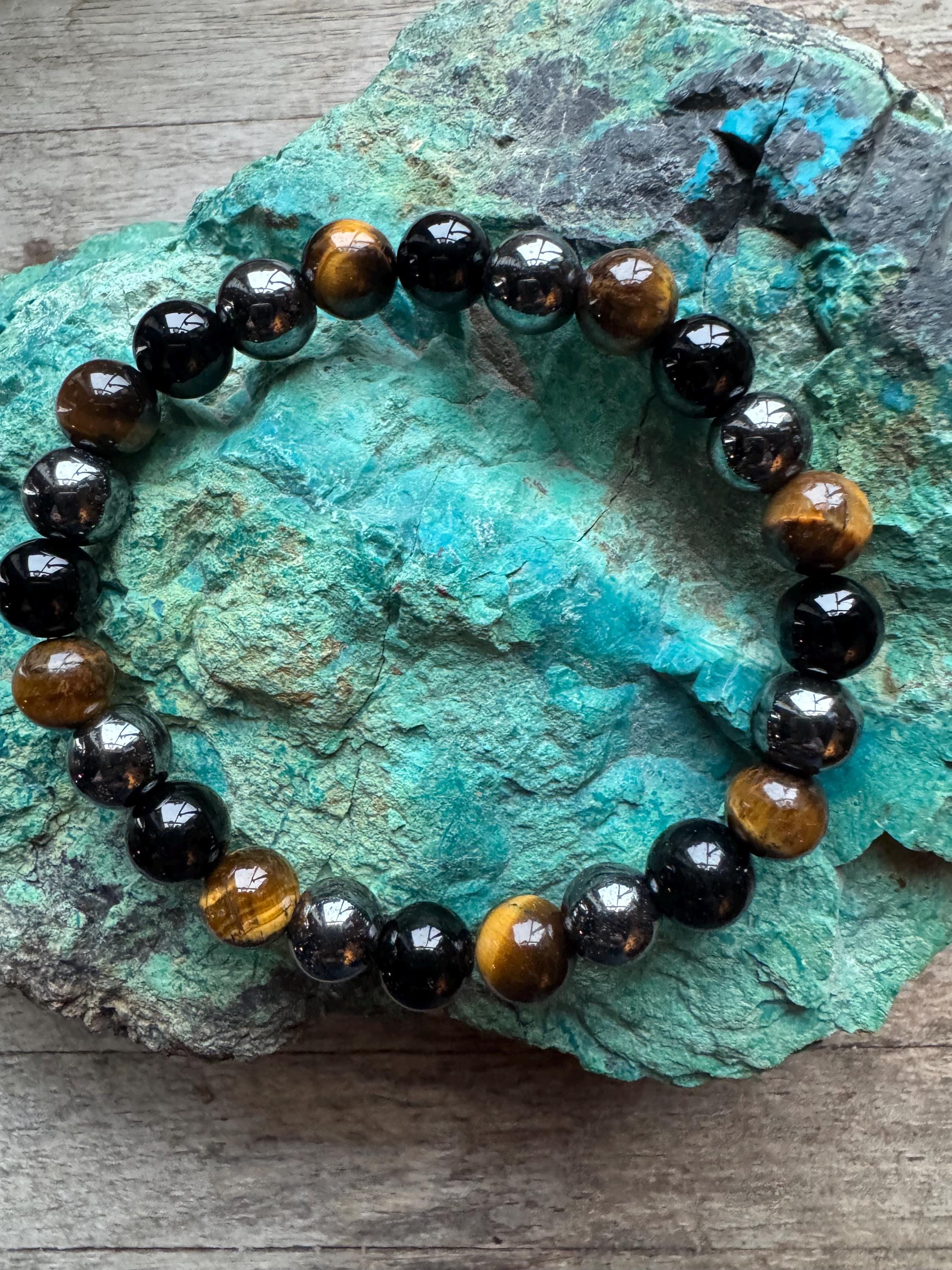Step into your strength with this handcrafted Triple Protection Bracelet, thoughtfully designed to support grounding, confidence, and energetic shielding. Made with genuine Hematite, Tiger’s Eye, and Black Onyx, this piece is perfect for anyone seeking balance, protection, and a little extra energetic armor throughout their day.