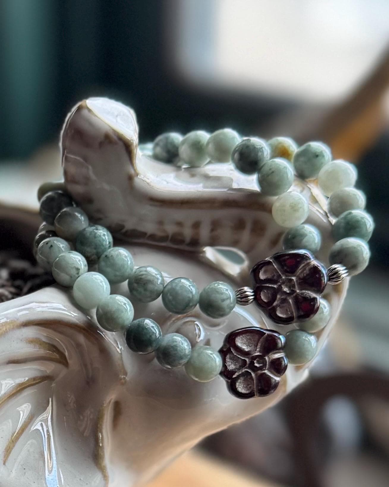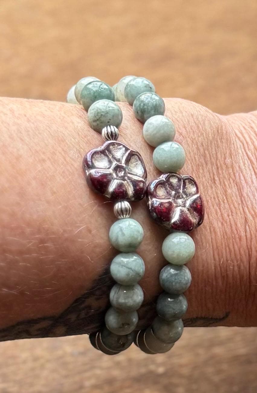 These stunning bracelets are created with 8mm Burmese Jade beads, beautifully paired with unique Czechoslovakian glass accents in bronze, ruby, and delicate Primrose flowers 🌸. The combination is soft yet rich, earthy yet elegant—truly eye-catching and timeless.