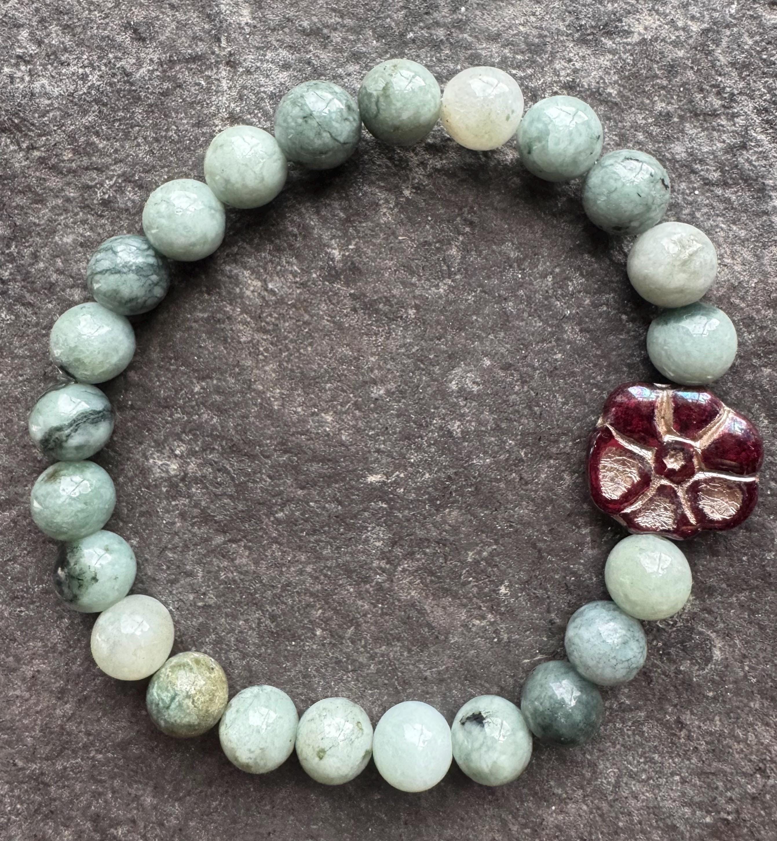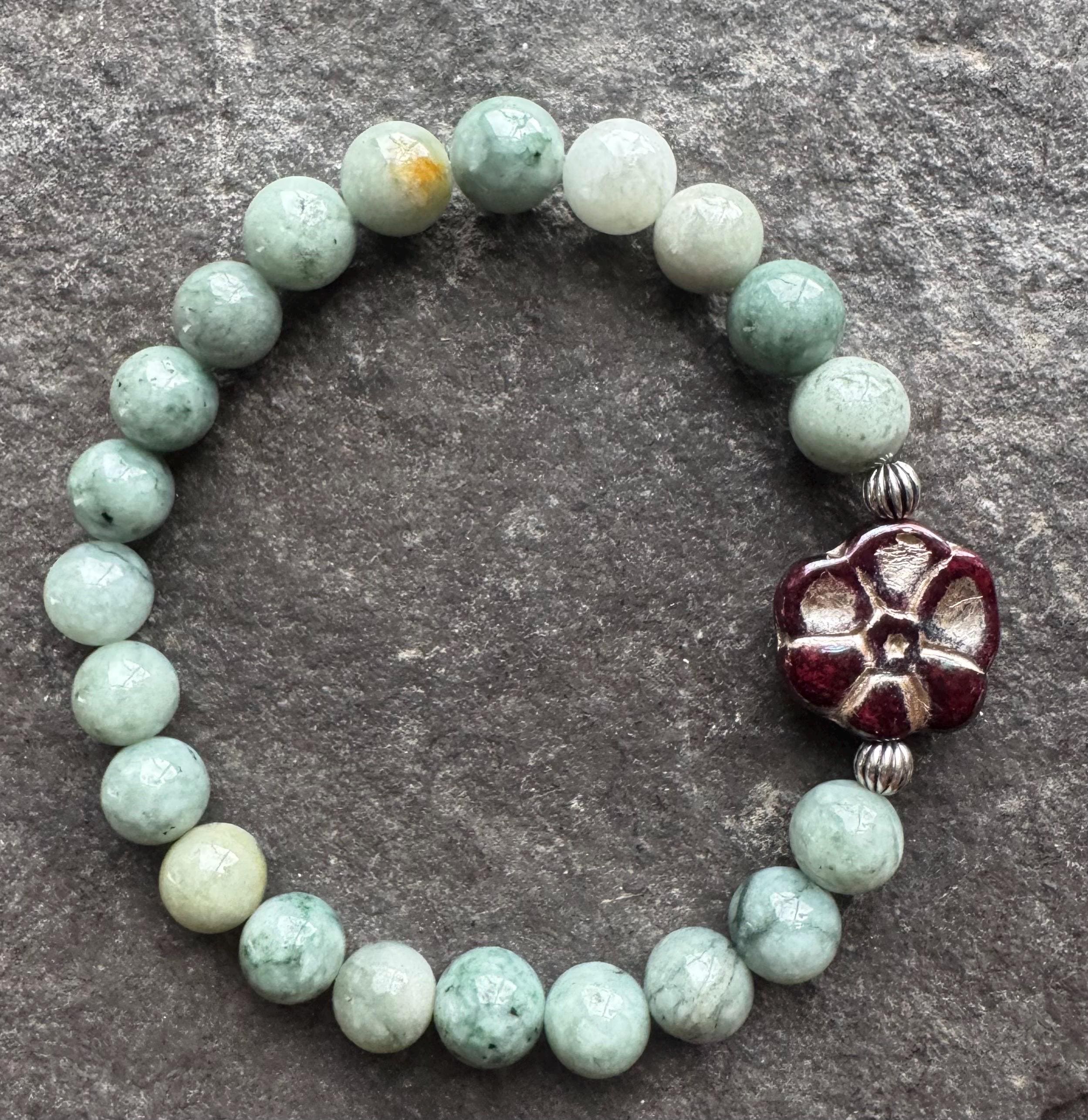 Burmese jade 8mm beads with Czechoslovakian pressed glass burgundy primrose bead