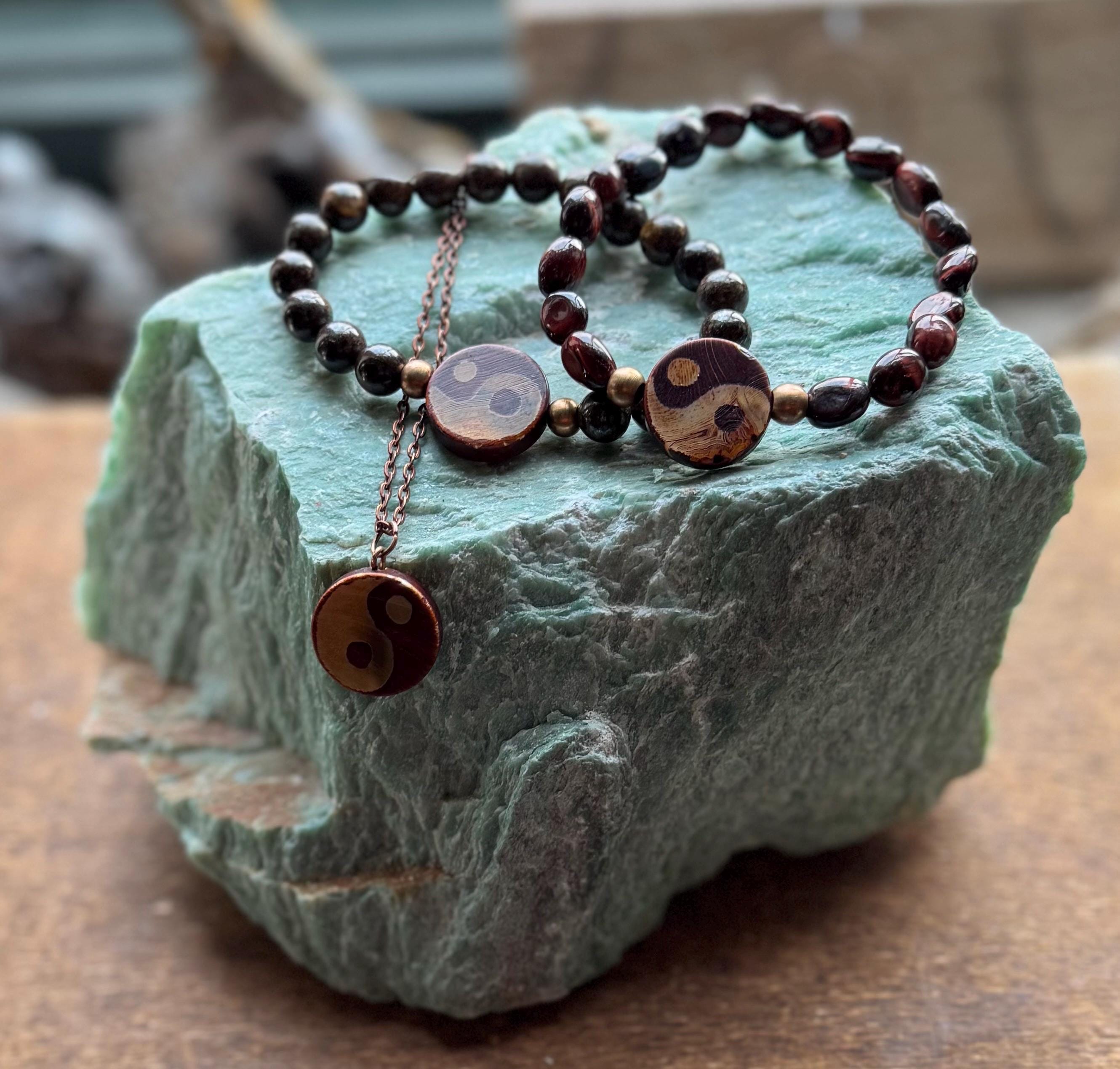 Yin Yang stone bead with agate inlay collection with Bronzite beads, Red Tiger’s eye nugget beads